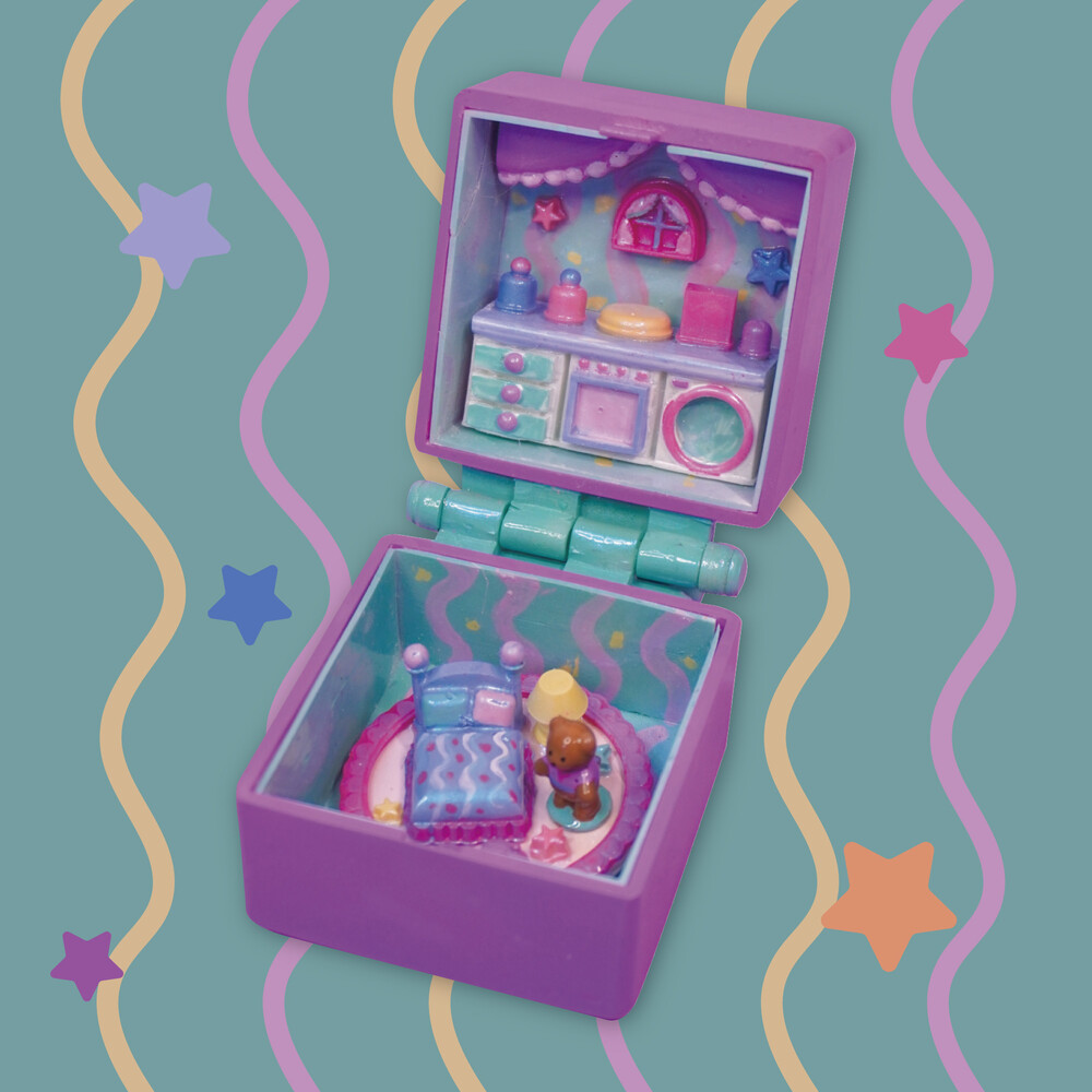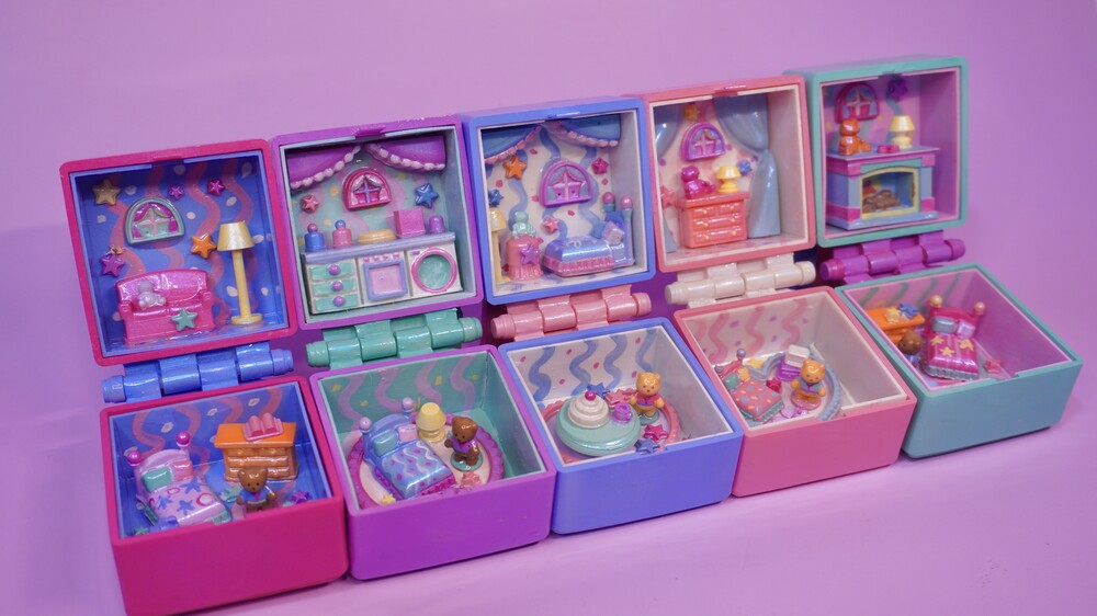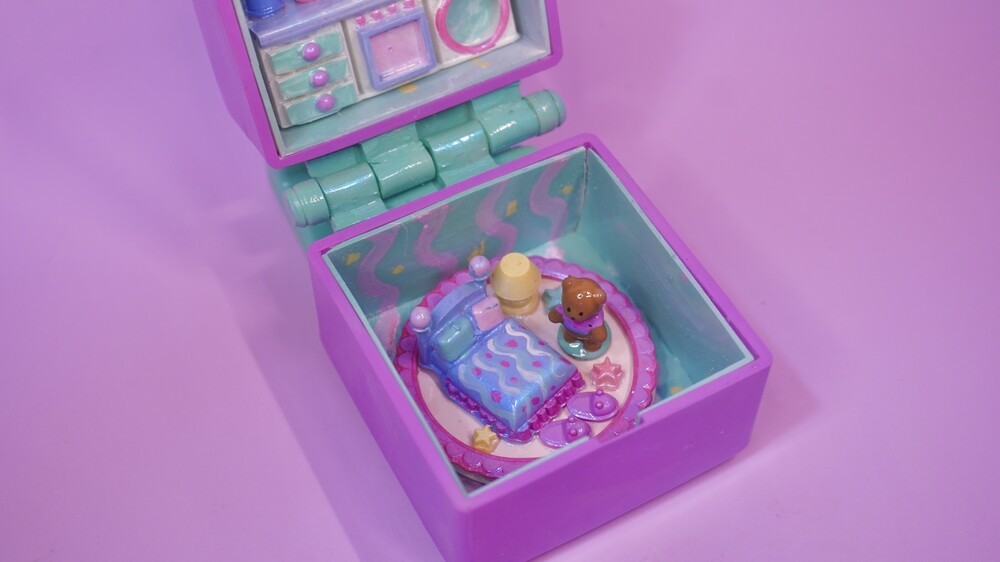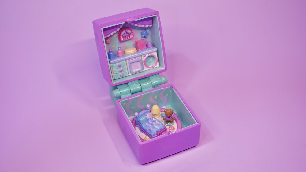 라벤더색 커튼이 있는 부엌과 곰돌이